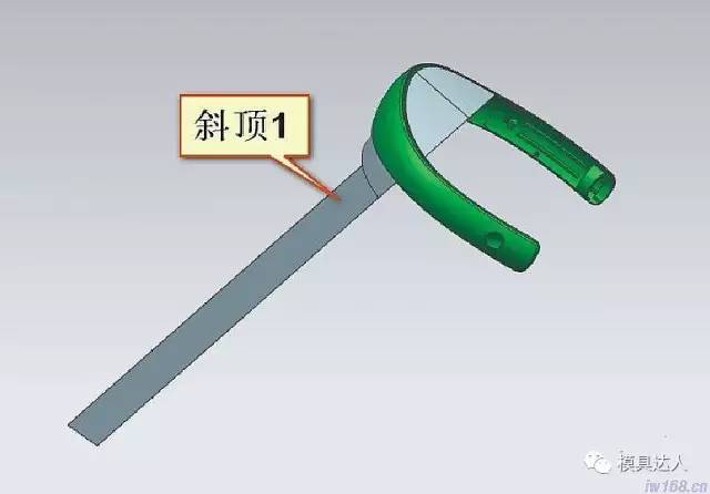 8. 倒扣3处采用斜顶方式出模,由于四周都是滑块,所以包夹力小,顶出就由这支斜顶承担。